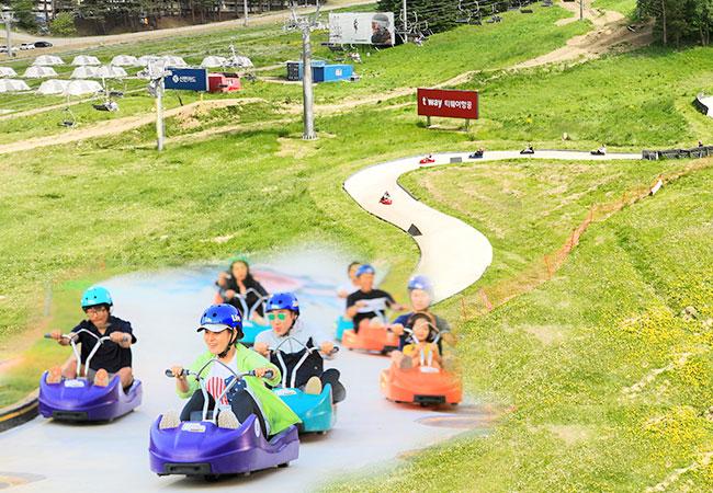 평창 모나용평 루지에서 낮에는 푸른 자연 속을, 밤에는 화려한 조명 아래에서 짜릿한 스피드를 즐겨보세요! ✨